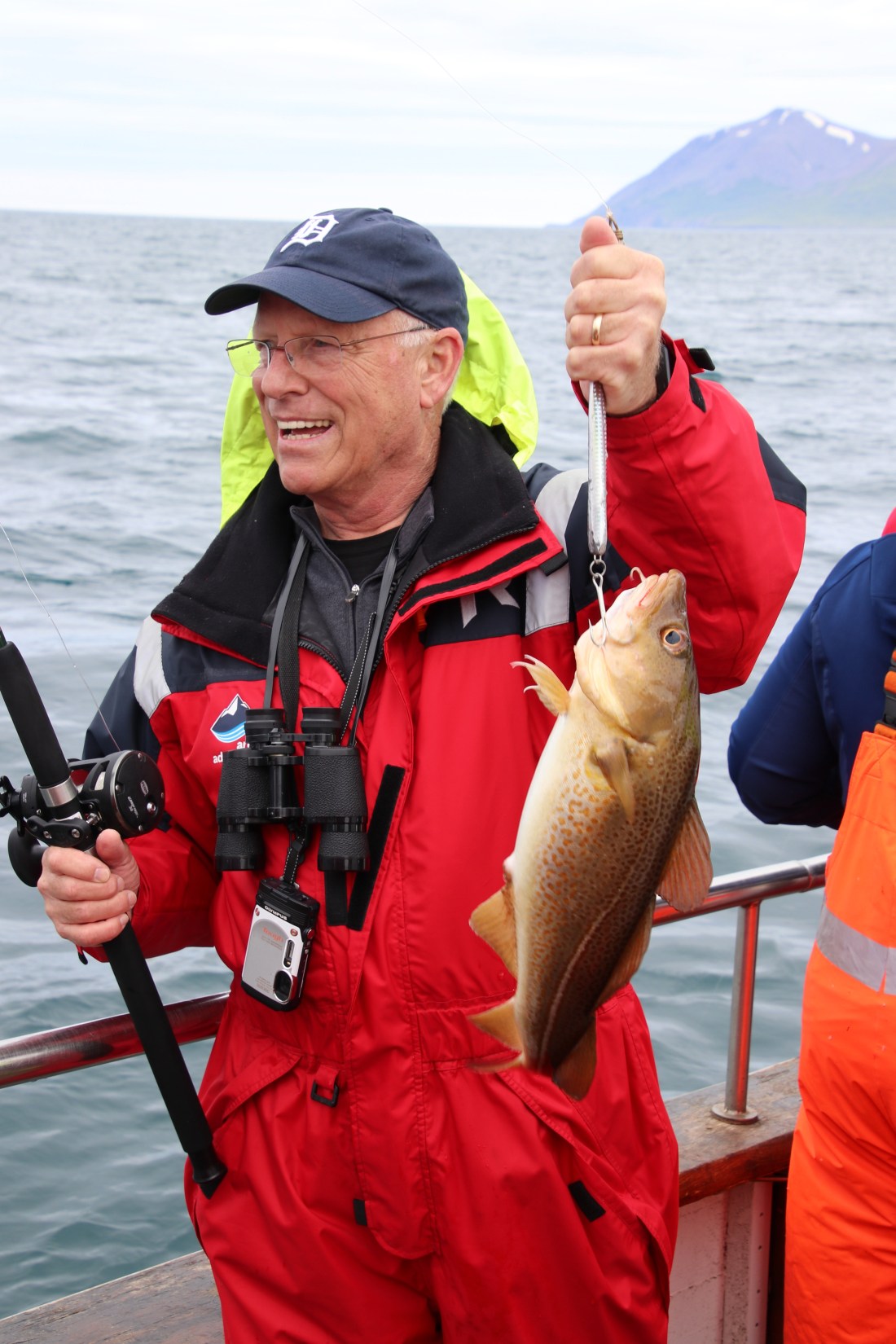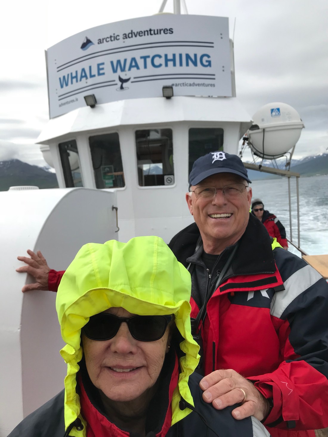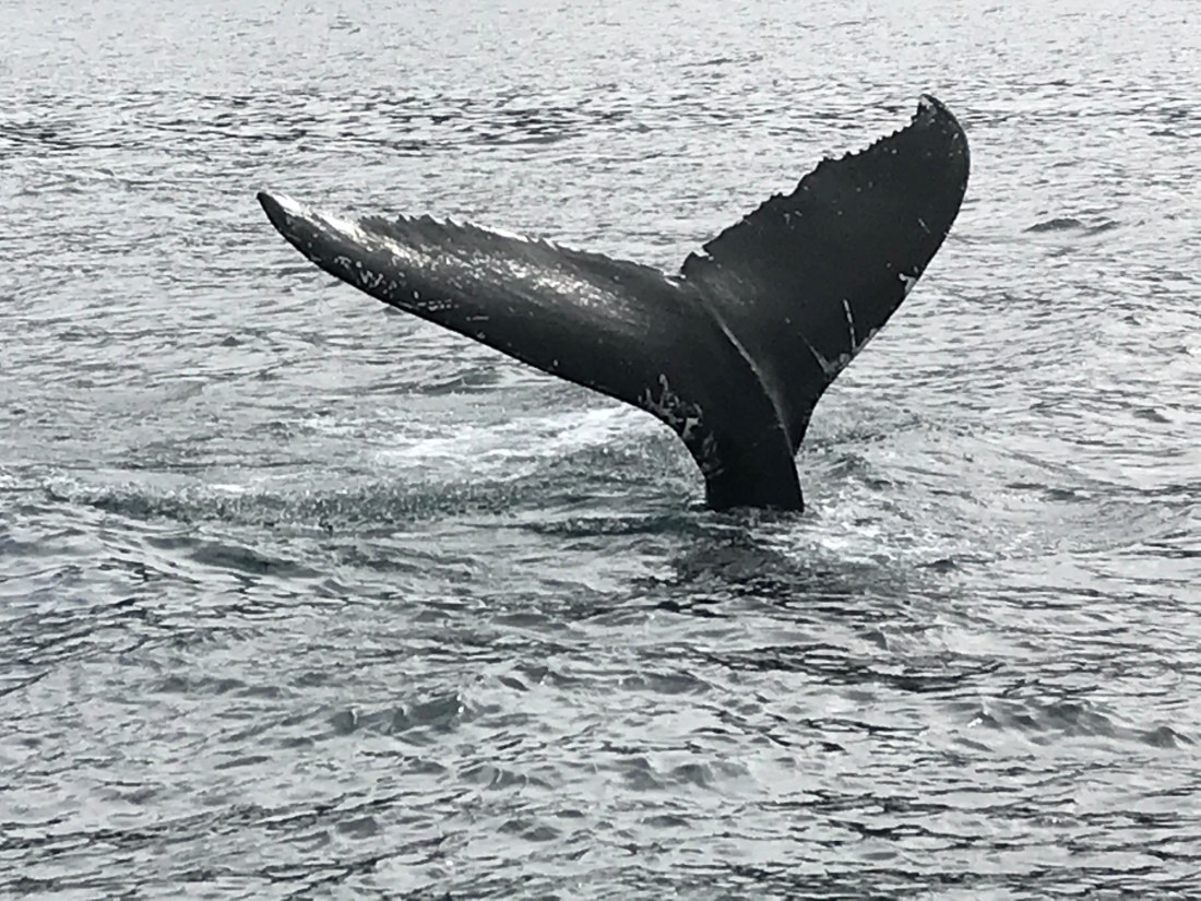 It was not raining, partly sunny, and a calm ocean. We saw lots of whales , caught a few fish and even got to eat them after we returned.