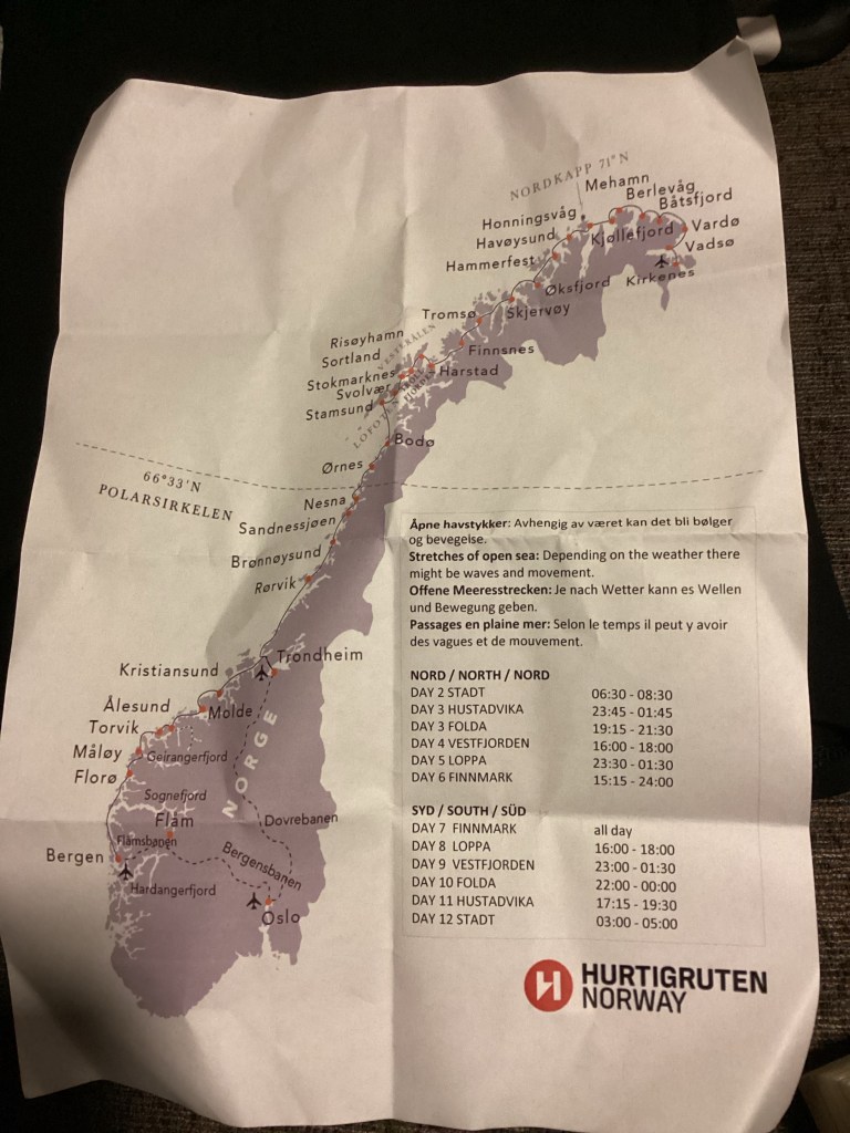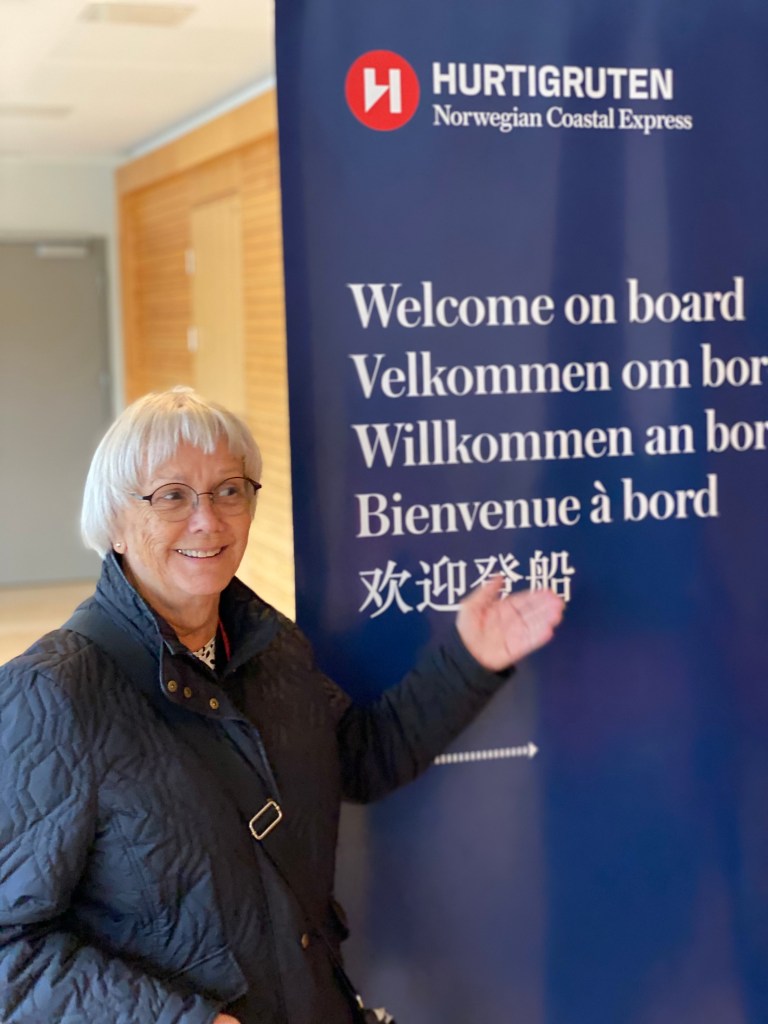 We finally board the Hurtigruten ship, The Nordlys( English translation, Northern Lights). It’s a commercial shipping, mail carrier, car ferry, passenger ship that has capacity for 471 people. It was down played to us …. Don’t expect it to be a typical cruise ship. There isn’t a theater. Casino, or swimming pool. However it is very comfortable, nice dining room with good food choices, a nice lounge with a full bar(7 different beers on tap). The cabins are comfortable with decent bathroom.