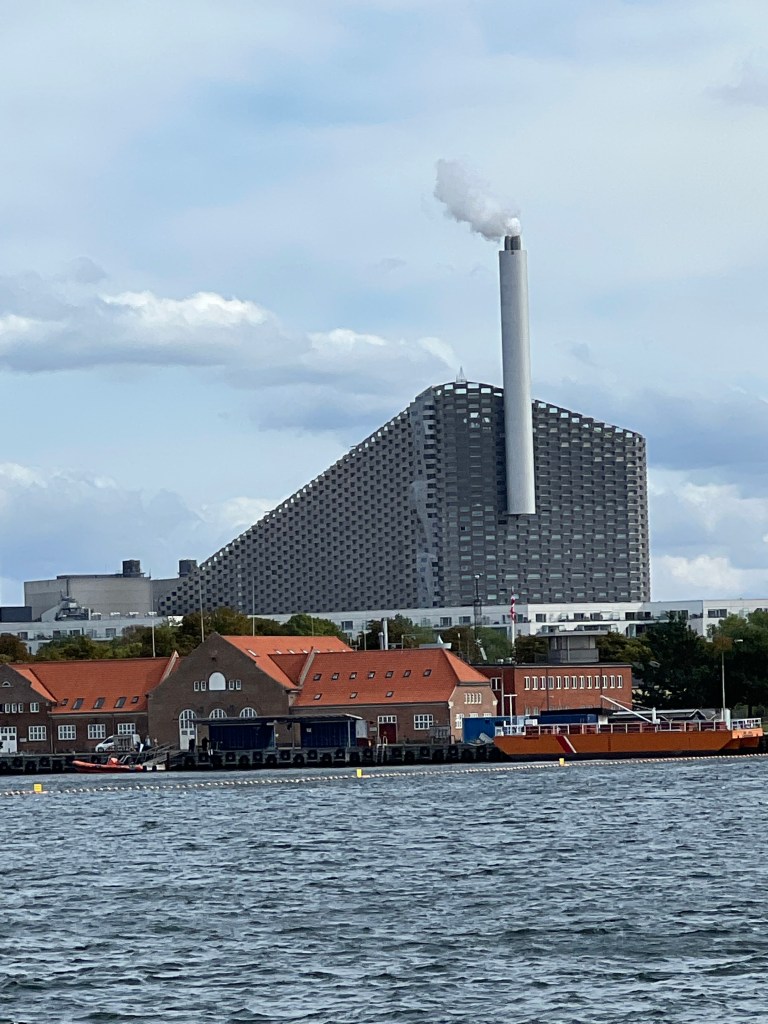Green begins with lots of bikes and bike riding. As pedestrians we have to be aware of the bikes or get run over!Old navy barracks and buildings repurposed as high end waterfront condos Copen Hill….. it’s called a “waste to energy” plant, burning sewer waste and other trash and generates electricity. In its design it incorporates a climbing wall with a cafe/bar at the top and an artificial ski slope that is open all year for downhill skiing.A converted shipyard repurposed into high end waterfront condos .Repurposed Waterfront condos made from shipping containers Danish lunch…… cold salmon, marinated herring, shrimp, roast beef and cheese with cranberry jam. Aquavit(Danish schnapps) is consumed with the herring. All of the lunch is then best with a Danish beer(Tuborg).