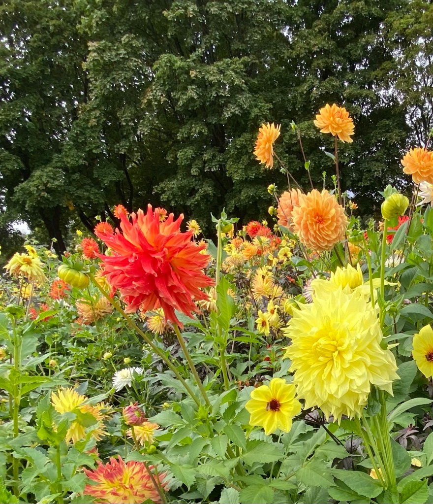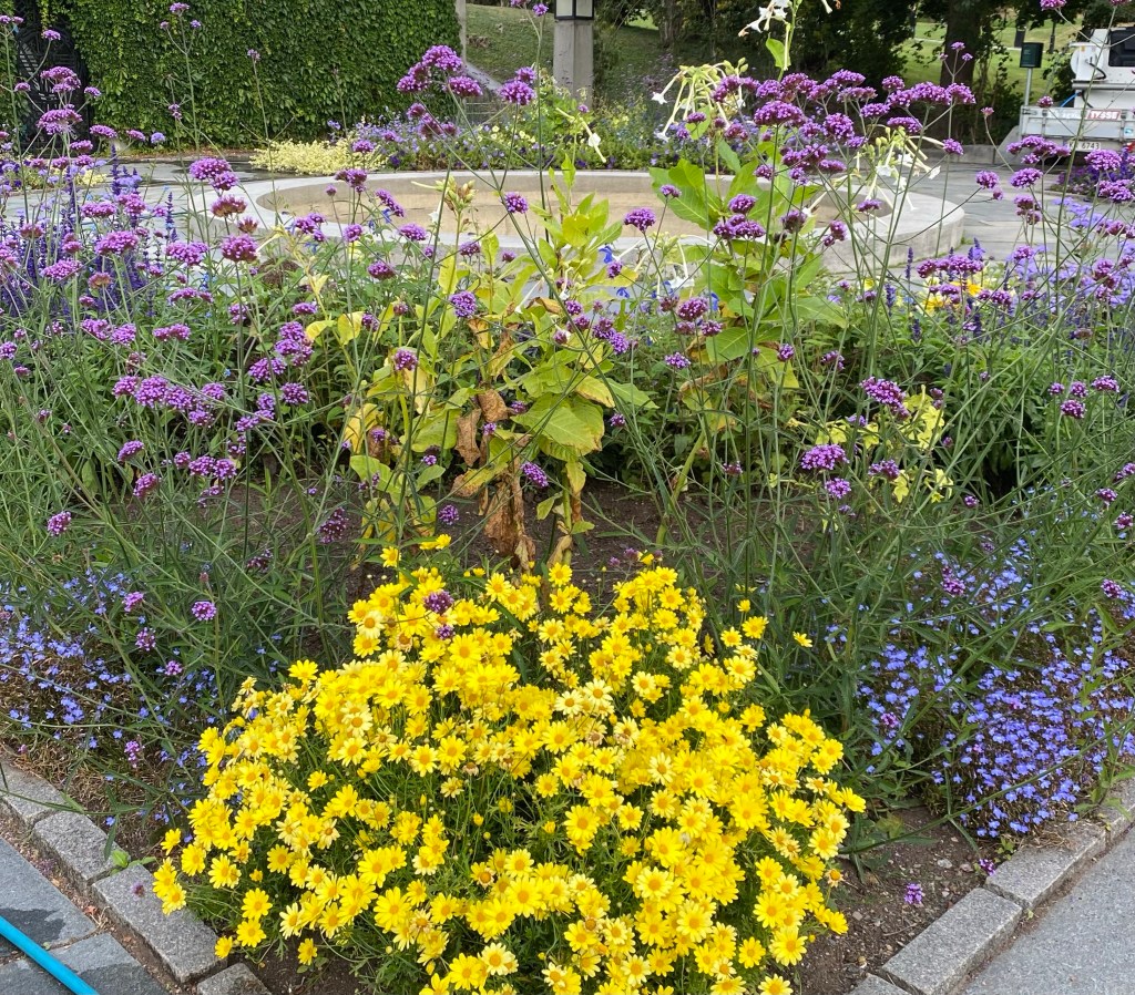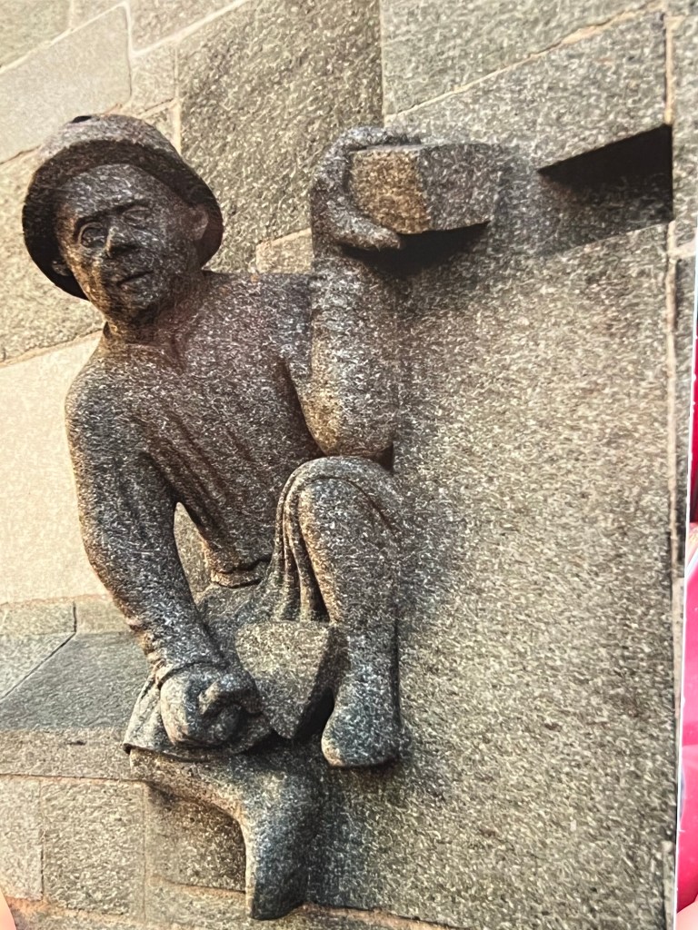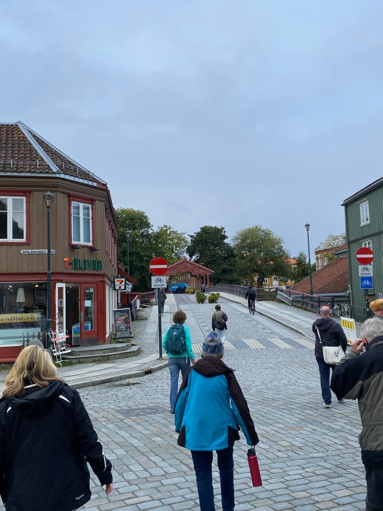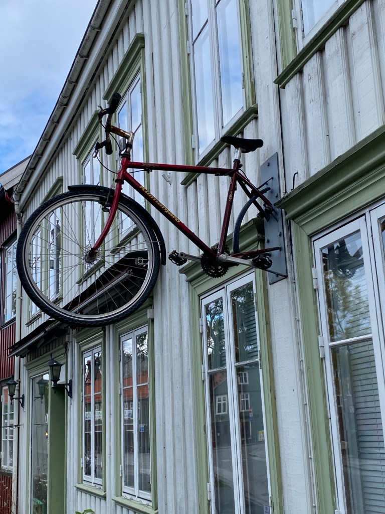 Walking into TrondheimA common theme thru out Norway; clean streets and well kept older homes and businesses.Many beautiful flower beds and it’s already late September with cool temps and fewer hours of daylight.The bicycle liftLots of bikes and lots of hills in Trondheim. This is an assist for a bike and rider. You sit on the bike and put your right foot on the slanted silver ramp. Then push a button, either slow or fast to help you up the hill! Several bike riders in Trondheim are riding electric bikes!Hills and bikes might not mix!Walking across a bridge near St Olaf’s cathedral.St Olaf’s Cathedral Beautiful church inside also.The organ was originally built in 1741 and has been extensively restored in the 1990s. The stained glass is beautiful too.The sculptures were started on the west side of the church in 1929. The sculptures were of historical and religious figures.The detail is amazing , the middle character is St Olaf as the kingThe sculptor took artistic freedom during a restoration of the church in recent history. Look close at the face….. it’s Bob Dylan, the musician. This sculpture is on the roof and the powers to be accepted the repair without a problem as the naked eye can’t discern the detail.This sculpture is hidden near the roof and is difficult to see. It’s a good luck charm. The story goes that an unfinished cathedral will never collapse and this sculpture has one more brick to install.