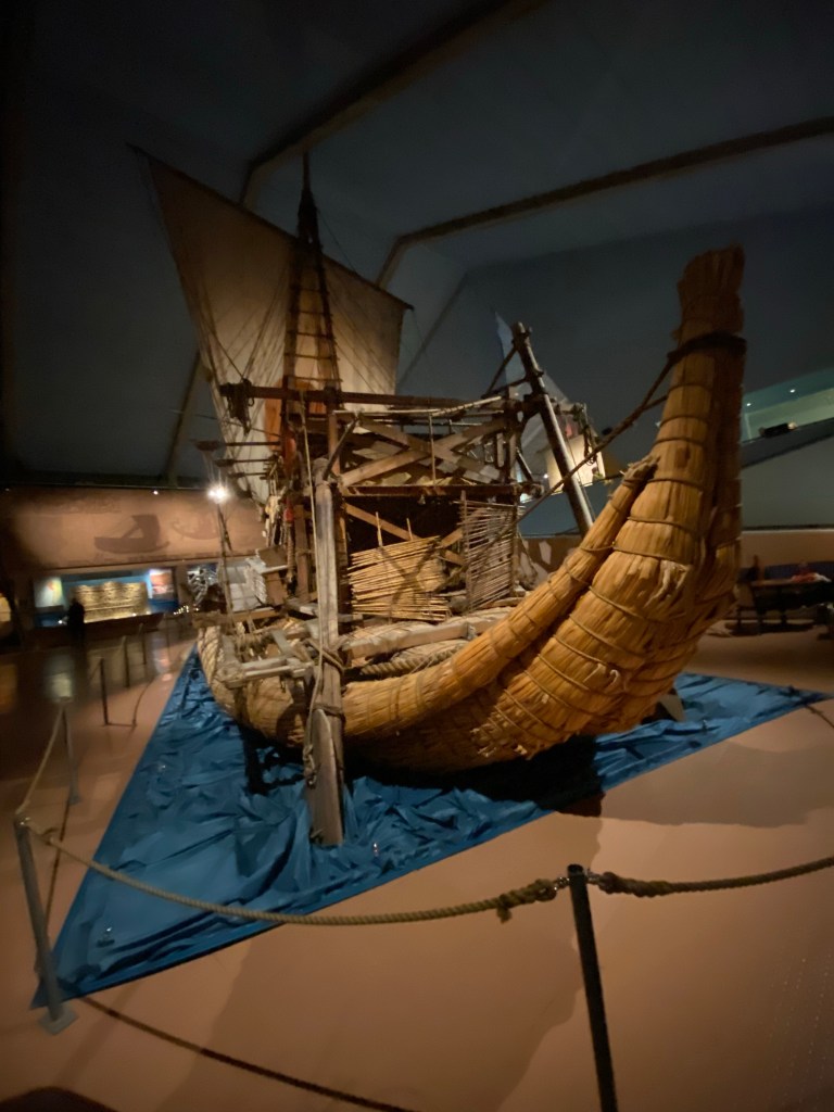 This is a 100 meter ski jump used only once a year. The facility is also used for biathlon training.A ski simulator under the ski jumpThe Fram museum houses the Gjoa and the Fram. Boats used by Viking explorers to find the northwest passage and be first to the South Pole. Roald Amundsen was the first to get to the South Pole, using the Fram to sail to the Antarctic in 1911. The Gjøa, the first boat to sail the northwest passage from Norway to Alaska and on down to near Seattle, a 3 year voyage completed in 1906. Thor Heyerdahl built and sailed the Kon-tiki across the pacific in 1947 to prove that it could be done a 1000 years ago.The Ra II, a reed boat that Thor built and sailed from Morocco to Barbados in 1970. He did this to prove that prehistoric civilizations could cross the oceans.Opera House on the left, designed to look like an iceberg. Rivals the Sydney opera house in its design and performance. The Munch Art Museum on the right. Edward Munch is most famous for his “Scream” series of paintings.On part of the roof of the opera house, you can walk to the very top of the opera house on this roof of stone tiles.View from the opera house roof. Patty is near the person in the red coatNew library, very nice inside. A gift shop, cafe with free coffee refills, a great place to spend a winter day reading a good book.