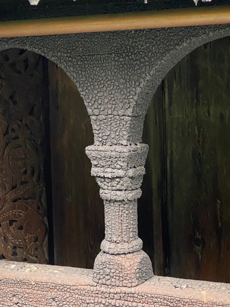 Followed this river across the mountains from Oslo to Flam. Flam is on the water in one of the Fjords.Sod/grass roofs are still in use todayWe stopped to visit a Stave church, it’s a 1,000 years old. One of only 27 still in existence in Norway. Stave describes the construction using spruce planks. It’s black because they didn’t have paint available and used a heated up pitch from the trees to preserve the wood. It turns black over time.Interesting architecture, considering the age of the construction.Interior of the churchCloseup of how the multiple layers of pitch ages over time
