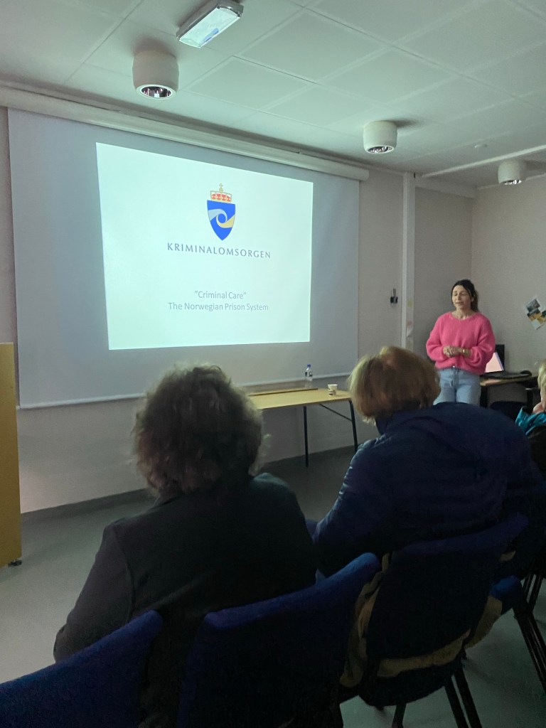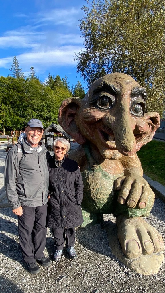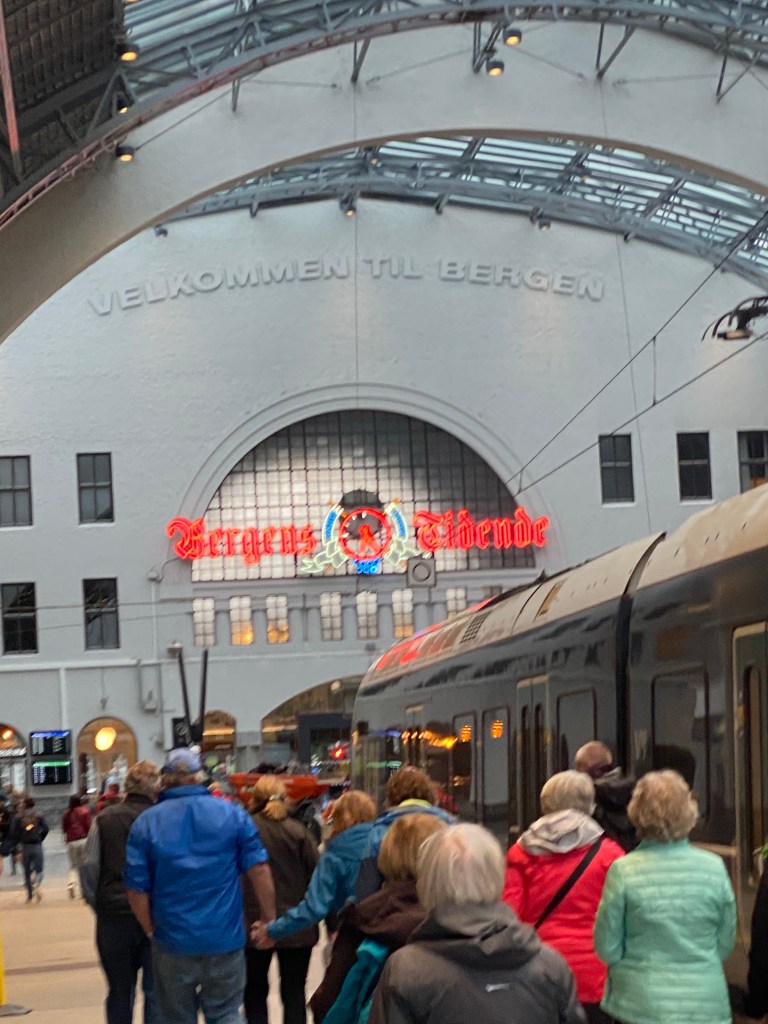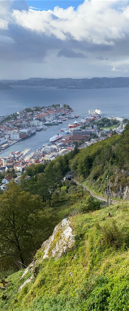 Our tour group from the top of the funicular overlooking BergenBergen in the background, a rare sunny day. We’ve been lucky with the weather. Heaviest rain has been at night or when we’ve had indoor plans or some of our bus rides.Our first troll encounterA walk with a local guide in an old part of Bergen. The guides name is Patrick and spoke perfect Midwest American English! Come to find out…. He is from Chicago and married a girl from London and they moved to Bergen a few years ago. In Europe, like the USA,Norway has trouble finding enough local people for the jobs that are available.Colorful and beautiful old homes A few old homes still preserved in downtown. Because all the construction was wood and the homes were built close together there were big fires that would burn large parts of the city every 50 years or so.Lots of hill side homes. The funicular can be seen in the middle of the hill and the top of the hill has a restaurant that dates back to 1920Bergen from the top of the funicularWe took a 30 minute trip out to a salmon fish farm. The water was to rough to ride zodiacs out to the pens and see the fish up close. So, we had conversations with a fish farm employee and two museum visits about life in the old days and a history of outboard motors. Norway lays claim to early outboard motor development. There is a controversy about fish farming and this company is proactive in explaining, in a convincing manner, how fish farming does not adversely affect the wild fish habitat. A controversial topic for sure.A great presentation and discussion about Norwegian prison system. This young lady is 37, mother of three and has been a prison guard for 12 years. Norway concentrates there prison system on rehabilitation and they make life for most prisoners very nice. The prisons are more like a small college campus. The cells are like dorm rooms. The maximum sentence for any crime is 21 years. In 2011 there was a home grown terrorist that set off a bomb in Bergen that killed a few people and that was the distraction for the larger crime of going to an island summer camp and used guns to murder 66 young people. He is a right wing neo Nazi, he is beyond evil. The controversy is how can this guy come up for parole every five years? He is unique in the prison system, he is in isolation to protect him from being killed by another prisoner. It might be time to rethink the prison system in Norway.Time for the reason we booked this trip. We board the Hurtigruten boat for the fjord trip to northern Norway. We will make 31 stops in 7 days/6 nights before we get to Kirkenes, Norway. We will travel in and out of the fjords with occasional diversions into the North Sea. Then we will go on to Lapland, Finland and Sweden.