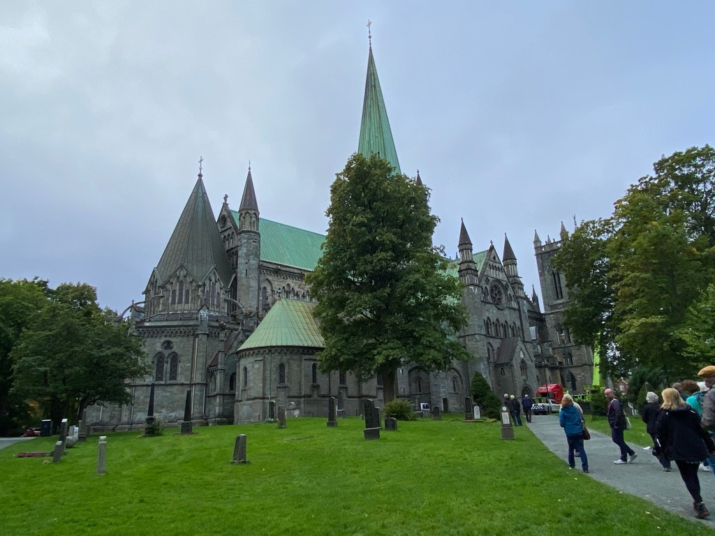 Trondheim was once the capital of Norway, its current population is 180,000. It was founded in 997 AD and is now a major university town and as well as having a major fishing industry. It is also an important pilgrimage site for followers of St Olaf, a Norwegian King and Catholic Martyr. We walked about the town with our trip leader and spent 30 minutes in Nidaros Carthedral. This church was originally built in 1000 AD but has been destroyed and rebuilt several times. It is a destination for St Olaf pilgrims.