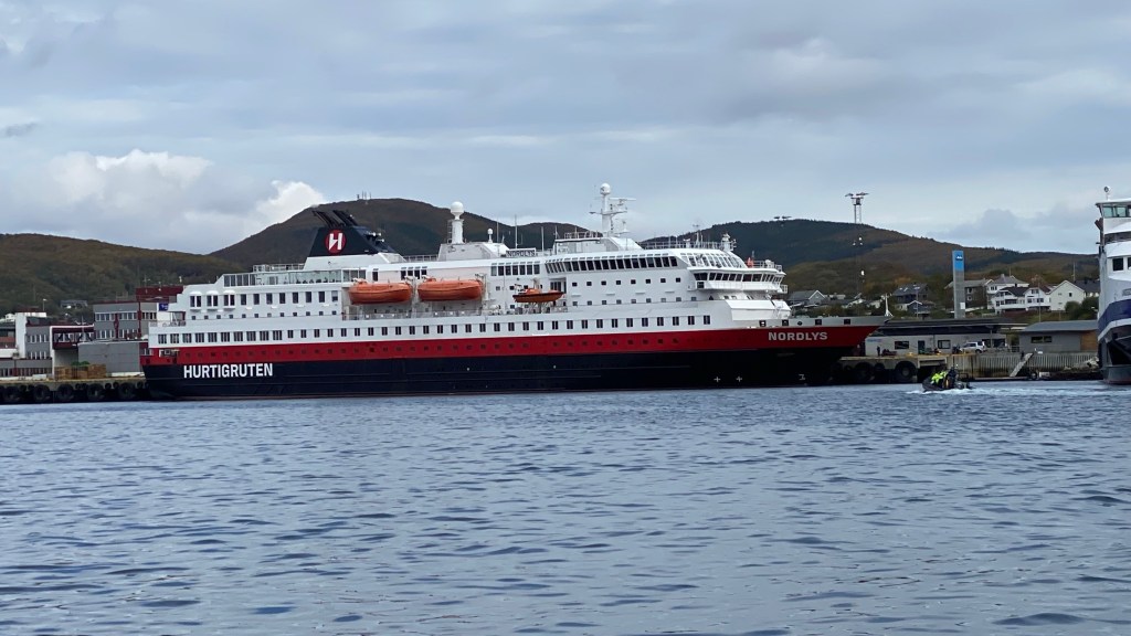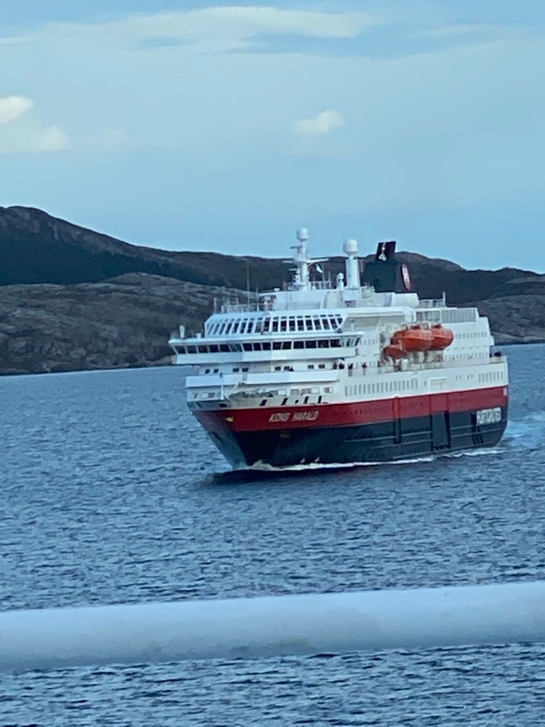 The fun beginsThe NordlysOur journey starts in Bergen and stops 31 times before getting to Kirkenes. We get off in 8 of these stops for walks about town, visits to museums; and a wild ride on a RIB boat!A sister ship heading the opposite direction. We travel most of the time in the fjords, we occasionally go out to the North Sea and then back to the fjords. The North Sea can be a bit rough. Further north we will be in and out of the Norwegian Sea. Non- drowsy Dramamine has kept Patty happy!Nice dining room and good food. Check out Patty’s plate vs my plate. I think Patty will lose some weight on this trip, I hope not to gain weight. We’ve been walking more than I do at home. One day we had 17,500 steps! I’ve enjoyed the fish for breakfast lunch and dinner! I probably don’t need my fish oil supplement on this trip!Our first stop, Urke, a small village of 53 people.Kayaking is popular. Not enough time to kayak, this was a 2 hour stop.Nice home in UrkeGetting on the tender to return to our shipWe’re on the tender heading back to our ship